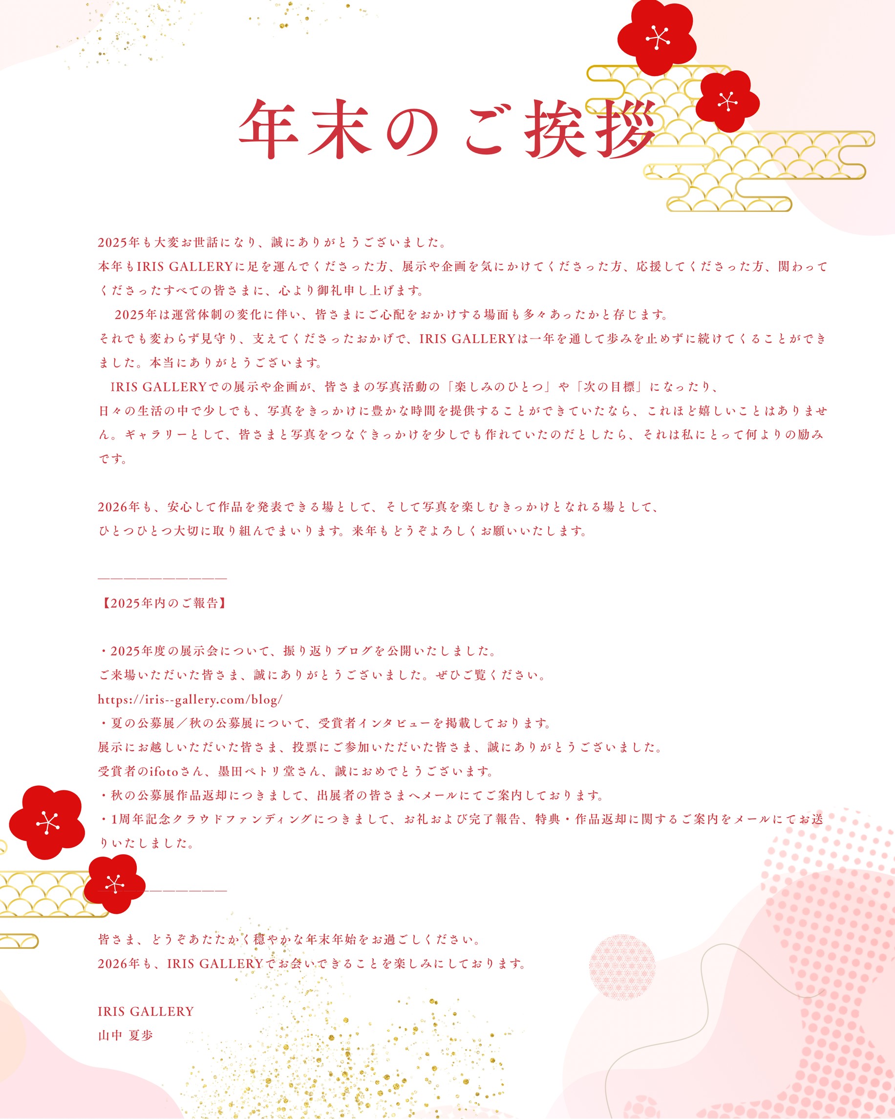 本年もIRIS GALLERYに足を運んでくださった方、展示や企画を気にかけてくださった方、応援してくださった方、関わってくださったすべての皆さまに、心より御礼申し上げます。